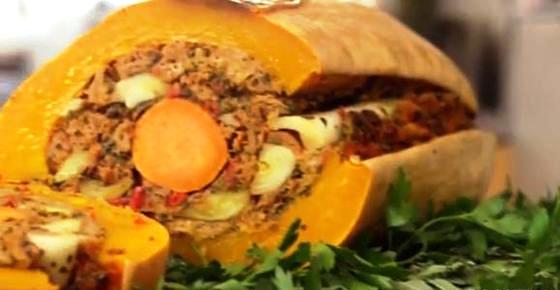 The non-meat solution is the Veggieducken, a sweet potato inside a leek, inside a banana squash, filled with stuffing.